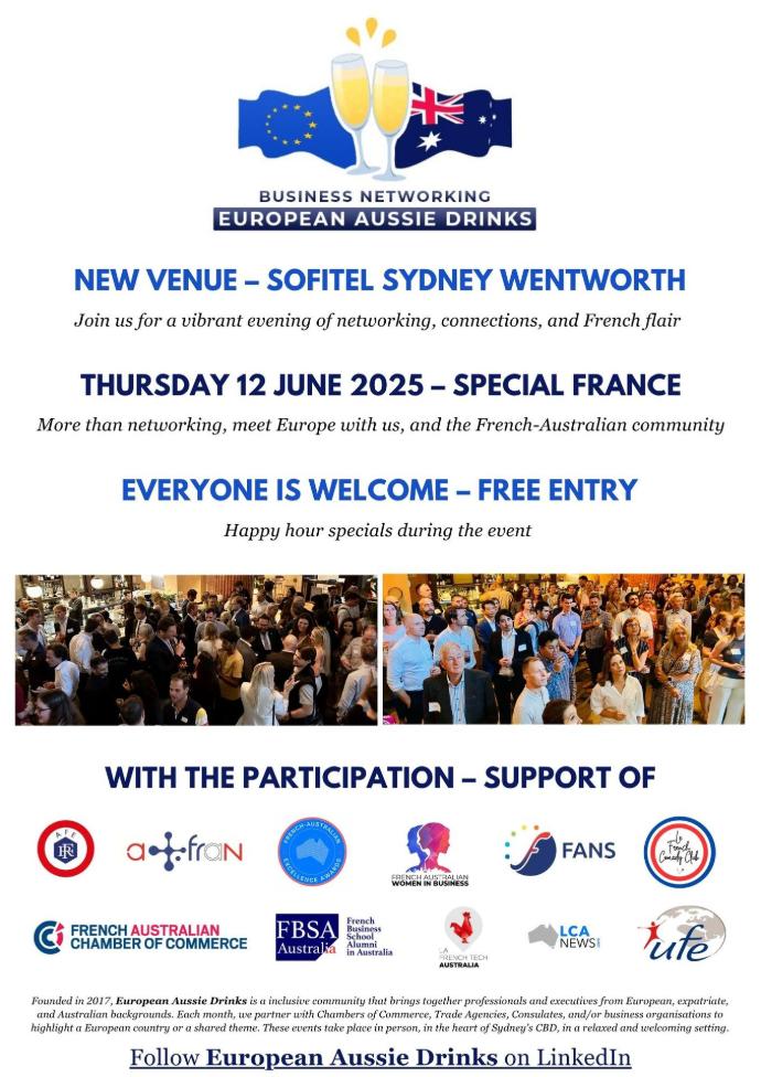 European Aussie Drinks holds monthly networking events. On Thursday 12 June from 5:30pm, join FANS at the Sofitel Wentworth with European Aussie Drinks for a special France edition.