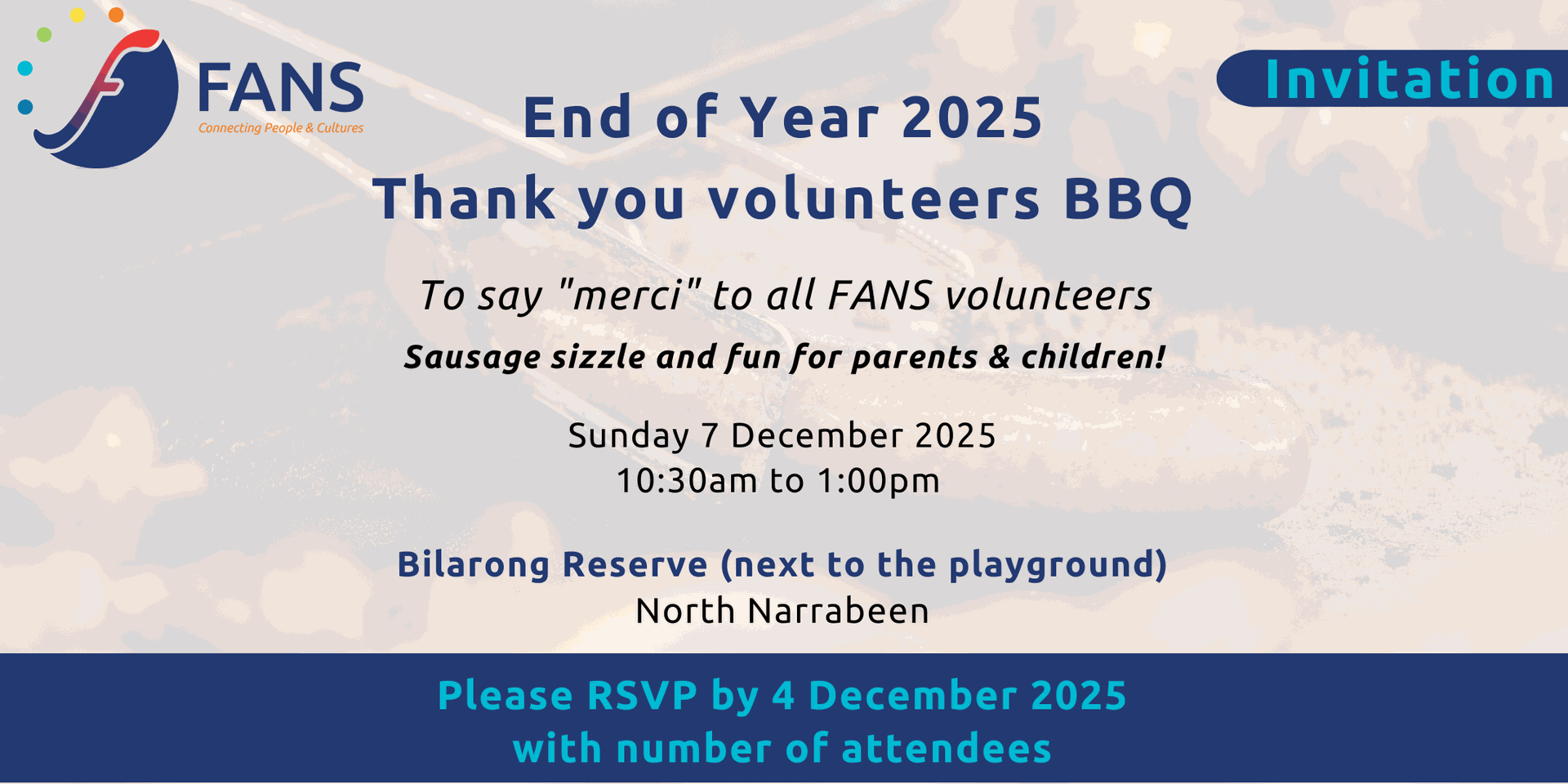 To thank all volunteers who have helped throughout the year, FANS invites you to join us for the annual “Thank you Volunteers” barbecue, on Sunday 7 December.